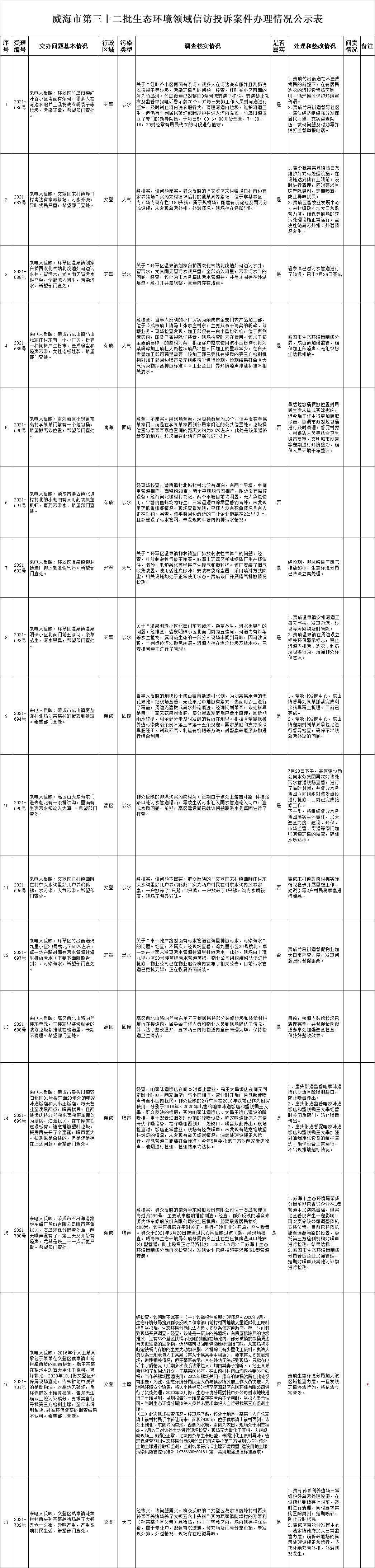 威海市生態(tài)環(huán)境領(lǐng)域信訪投訴案件及邊督邊改公開情況(第三十二批)