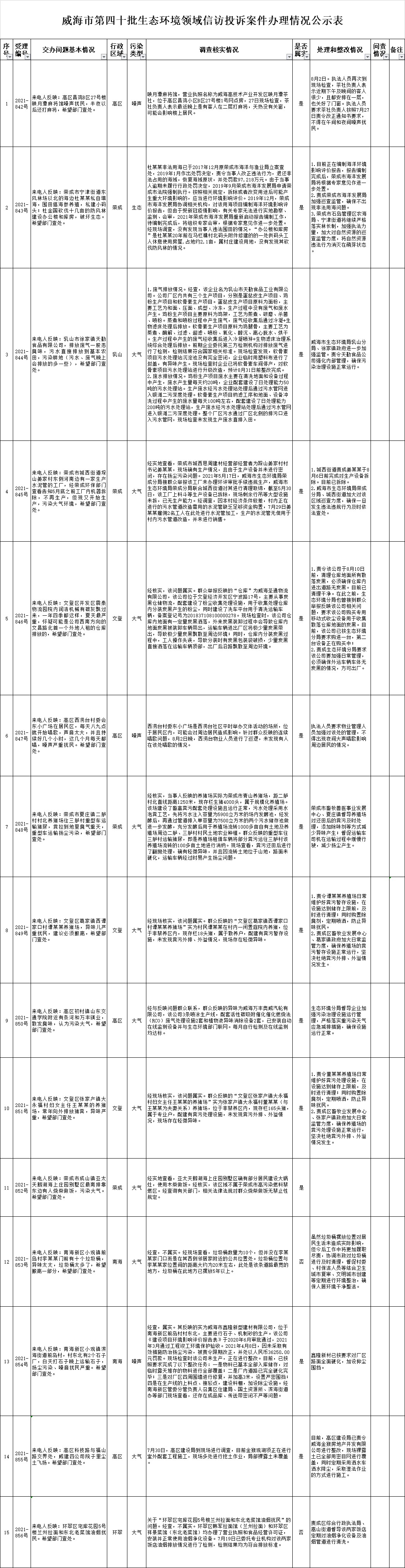 ??????威海市第四十批生態環境領域信訪投訴案件交辦清單共計15件。截至8月19日17時,已全部辦結,其中屬實13件,不屬實2件。