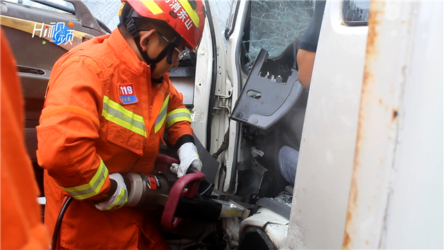 消防員到達現場后,首先對事故現場進行警戒勘察。消防員經過勘察后發現,被困司機腿部被卡住,無法轉動身體配合施救。消防員根據現場情況,迅速分為兩組進行救援。一組利用液壓剪擴鉗將車門打開;另一組利用消防車牽引繩,將事故車輛拖開一定距離,為后續救援提供空間。
