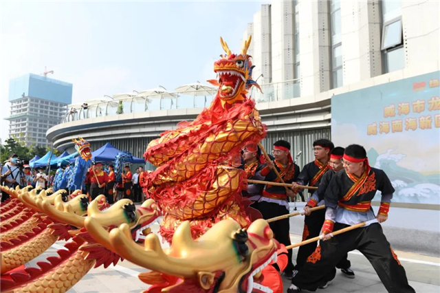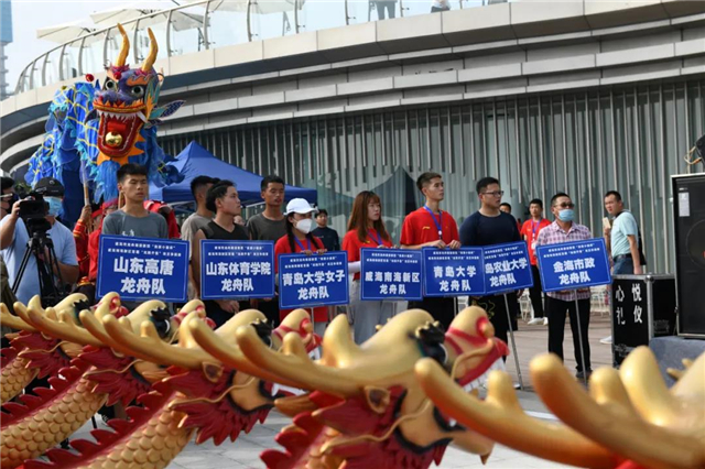 ??????9月12日上午,在南海新區香水河畔,威海市龍舟邀請賽暨“奧萊小鎮杯”威海南海新區首屆“龍騰齊魯”龍王爭霸賽開賽,山東省各地的19支隊伍展開激烈競渡,“同河”競技。