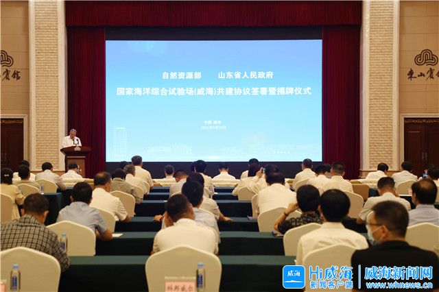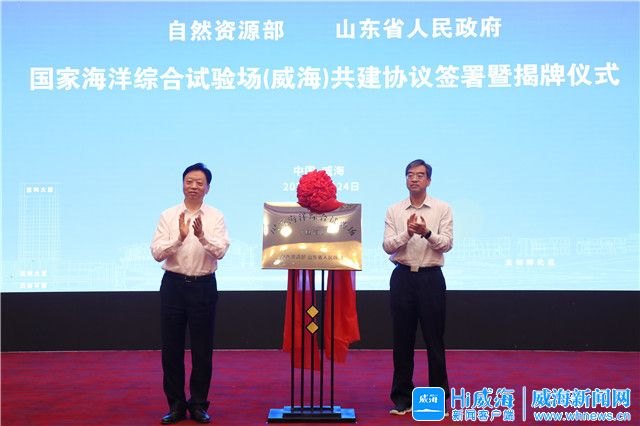 威海新聞網訊 9月24日,自然資源部與山東省人民政府共建國家海洋綜合試驗場(威海)協議簽約暨揭牌儀式舉行。自然資源部副部長、國家海洋局局長王宏,山東省副省長曾贊榮,市領導張海波、高書良出席,王宏、曾贊榮、張海波分別致辭,王宏、曾贊榮分別代表自然資源部、山東省人民政府簽署《自然資源部山東省人民政府共建國家海洋綜合試驗場(威海)協議》,并共同為“國家海洋綜合試驗場(威海)”揭牌。