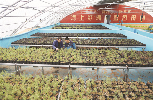 ??????位于東浪暖村濱海生態種質繁育與開發示范基地的10000多平方米溫室大棚里,繁育的各種耐鹽堿植物的幼苗正茁壯成長。在南海新區香水河入???,從基地繁育出的上萬棵檉柳枝繁葉茂,讓這里曾經近30畝的荒島變成“綠洲”。
