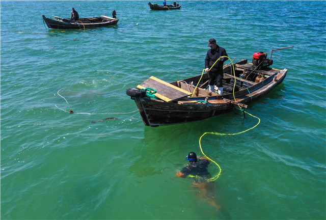??????其中,通過人工海底種植的方式,榮成市桑溝灣目前已形成了3000畝海草床,且形成了藻、參、貝、魚立體化的多營養層綜合健康養殖模式。