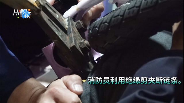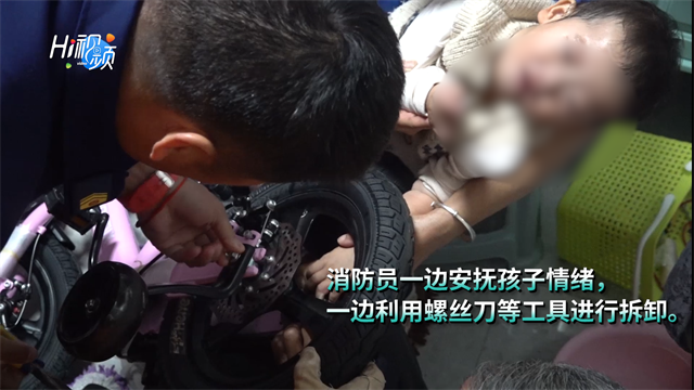 ??????消防員經觀察發現,幼兒的手指被卡在自行車后輪胎牙盤和鏈條中間位置,幼兒大哭不止。消防員一邊安撫孩子情緒,一邊利用螺絲刀等工具進行拆卸。隨后,又用絕緣剪夾斷鏈條。