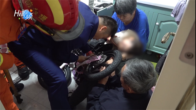 ??????近日,環翠區一幼兒因好奇將手伸進了兒童自行車內,不慎被卡,轄區青島路消防救援站消防員立即趕赴現場救援。