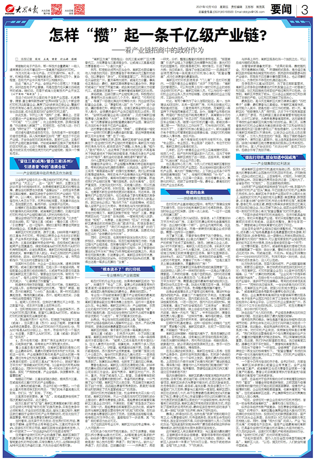 ??????12月10日出版的大眾日報刊發(fā)《要走的三星沒走,沒打算來的惠普來了》《怎樣“攢”起一條千億級產(chǎn)業(yè)鏈?》,解碼威海高新區(qū)精研產(chǎn)業(yè)鏈規(guī)律巧做產(chǎn)業(yè)鏈招商,“攢”起一條千億級打印機產(chǎn)業(yè)鏈的不凡之路。文章提出,深入探究威海高新區(qū)如何“攢”起這條千億級產(chǎn)業(yè)鏈,才會體會到它的其來有自。甚至可以說,正是打印機產(chǎn)業(yè)鏈的復雜難解,才給威海高新區(qū)提供了施展身手的空間和機會。從這個角度看,破解其成功玄奧,本身就是為當前正成為招商主流方向的產(chǎn)業(yè)鏈招商,提供一個精彩范本。以下為報道全文: