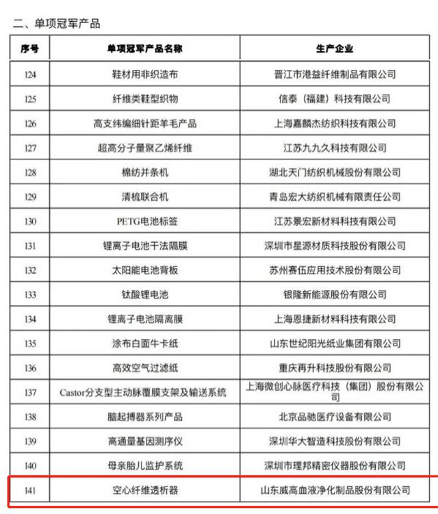 ??????近日,工業和信息化部、中國工業經濟聯合會聯合公布第六批制造業單項冠軍名單,我市2家企業成功入選。其中,山東華菱電子股份有限公司入選全國制造業單項冠軍示范企業,山東威高血液凈化制品股份有限公司空心纖維透析器入選全國制造業單項冠軍產品。