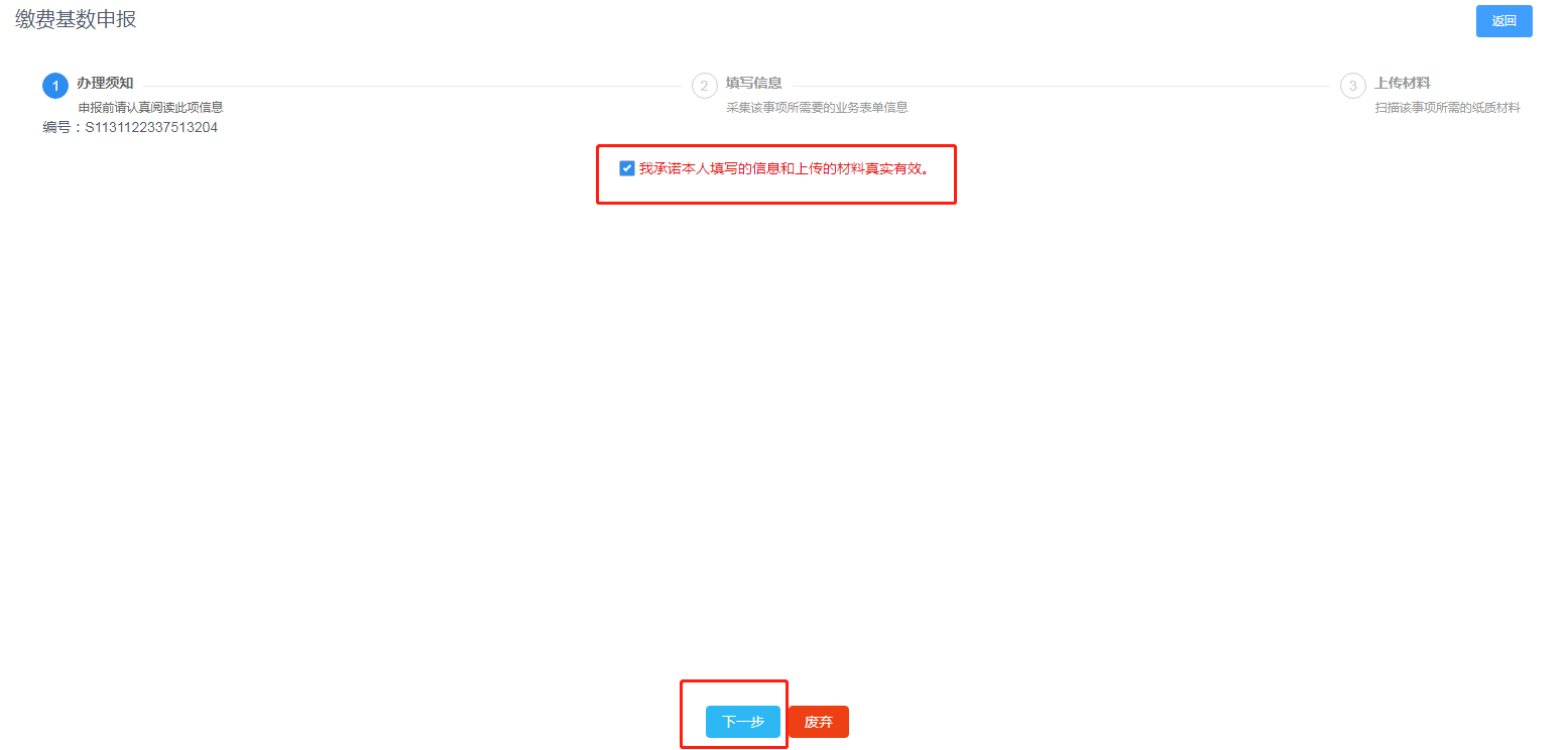 ??????3.勾選“我承諾本人填寫的信息和上傳的材料真實有效”,點擊“下一步”。