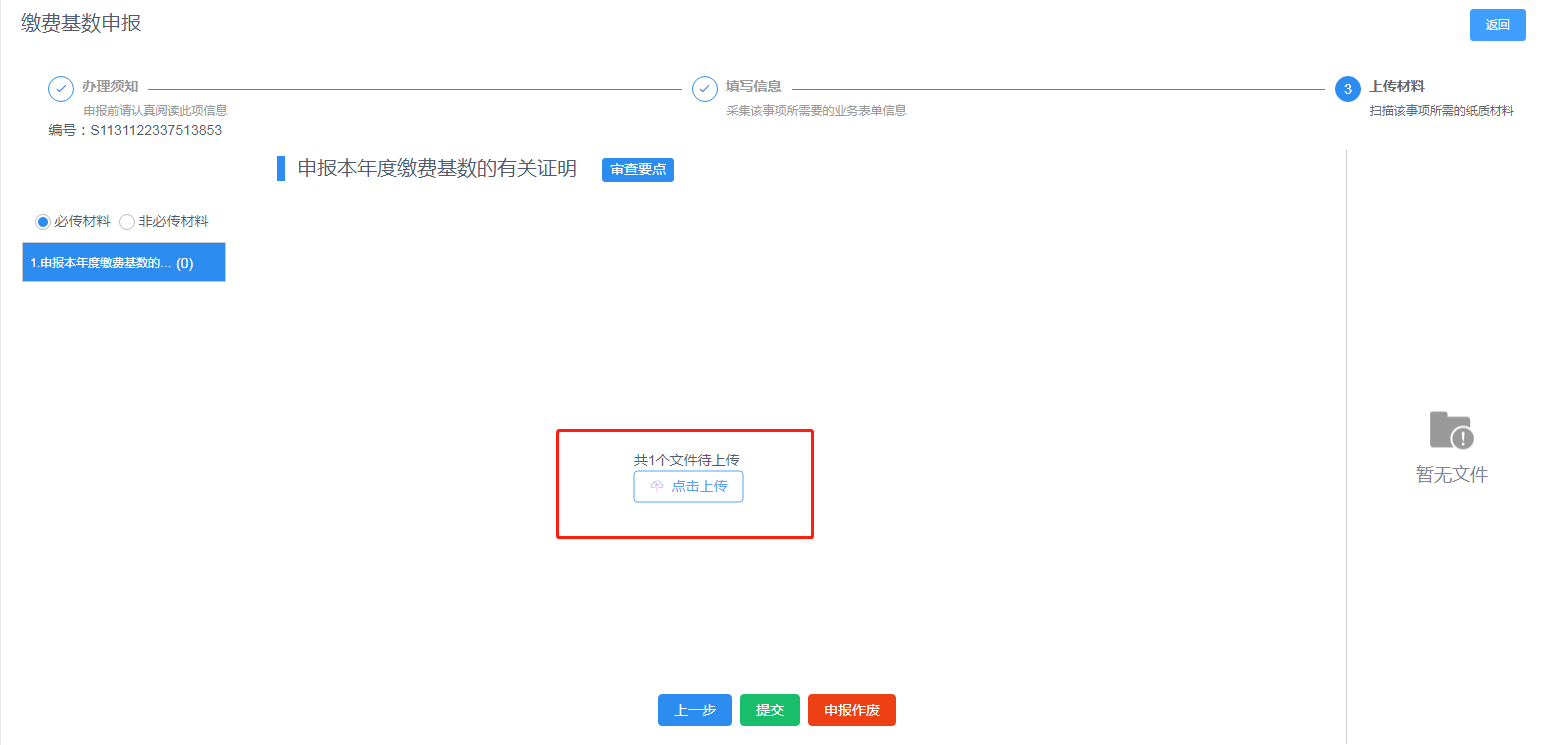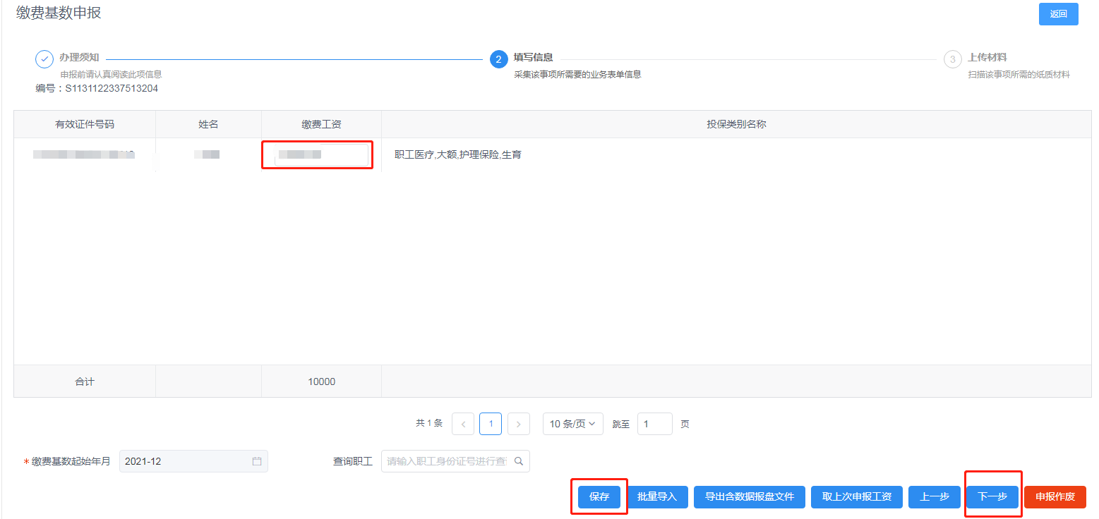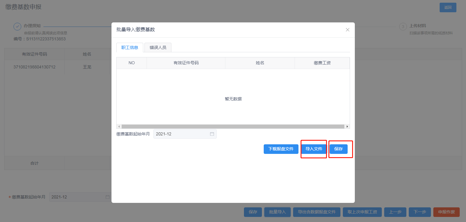 ??????4.點擊“批量導入”,下載報盤文件,批量錄入職工繳費基數后,導入文件,保存,或著手工錄入繳費基數,保存,點擊“下一步”。