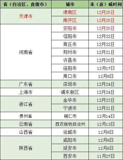 ??????自天津市(津南區、南開區)、安陽市、深圳市、上海市、金華市、信陽市、商丘市、鄭州市、許昌市、寧波市、洛陽市、銅仁市、西雙版納自治州、運城市、周口市、咸陽市、延安市、西安市等發生本土疫情地區的入(返)威人員,與已公布的陽性感染者活動時空軌跡重疊人員,到過或途經中高風險地區人員,請第一時間主動向所在社區(村)、住宿賓館和單位報備,配合落實屬地疫情防控指揮部管控措施和相應核酸檢測要求。