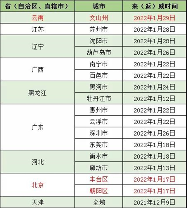 ??????自文山州、北京市(豐臺區、朝陽區)、蘇州市、沈陽市、葫蘆島市 、南寧市、百色市、黑河市、惠州市、云浮市、深圳市、東莞市、衡水市、廊坊市、牡丹江市、天津市(全域)等發生本土疫情地區的入(返)威人員,與已公布的陽性感染者活動時空軌跡重疊人員,到過或途經中高風險地區人員,請第一時間主動向所在社區(村)、住宿賓館和單位報備,配合落實屬地疫情防控指揮部管控措施和相應核酸檢測要求。