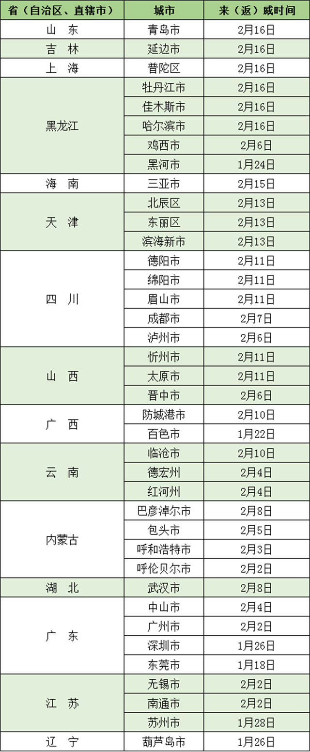 ??????請自青島市、上海市(普陀區)、延邊市、牡丹江市、佳木斯市、哈爾濱市、三亞市、天津市(北辰區、東麗區、濱海新區)、德陽市、綿陽市、眉山市、忻州市、太原市、防城港市、臨滄市、武漢市、巴彥淖爾市、成都市、瀘州市、晉中市、雞西市、包頭市、德宏州、紅河州、中山市、呼和浩特市、呼倫貝爾市、無錫市、南通市、廣州市、蘇州市、葫蘆島市 、百色市、黑河市、深圳市、東莞市等發生本土疫情地區的入(返)威人員,與已公布的陽性感染者活動時空軌跡重疊人員,到過或途經中高風險地區人員,請第一時間主動向所在社區(村)、住宿賓館和單位報備,配合落實屬地疫情防控指揮部管控措施和相應核酸檢測要求。