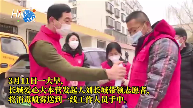 ????3月11日一大早,長城愛心大本營發起人、全國道德模范劉長城就帶領志愿者們,拉著滿滿一車的消毒噴霧劑,奔走在環翠區的各個社區中,將消毒噴霧送到一線工作人員手中,為抗疫工作人員多增加一道安全保障。到達社區后,劉長城一邊介紹消毒噴霧劑如何使用一邊向工作人員身上、手上噴灑演示。