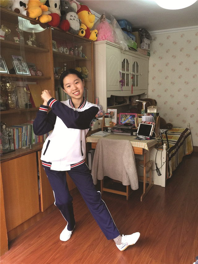 ????因為自幼喜歡文體運動,所以伴著音樂節(jié)點跳健身操成了陶韻凝課間運動時的首選方式。特別是由于上網(wǎng)課要長時間盯著電腦或手機屏幕,這就更需要她通過健身運動緩解視覺疲勞。除了健身操,她還喜歡做仰臥起坐、俯臥撐等適合在室內(nèi)進行的健身方式。“只要居家學習不結束,我們就要一直保持良好的學習狀態(tài),堅持上網(wǎng)課,而必要的健身運動就是實現(xiàn)這一切的保證。”陶韻凝說。