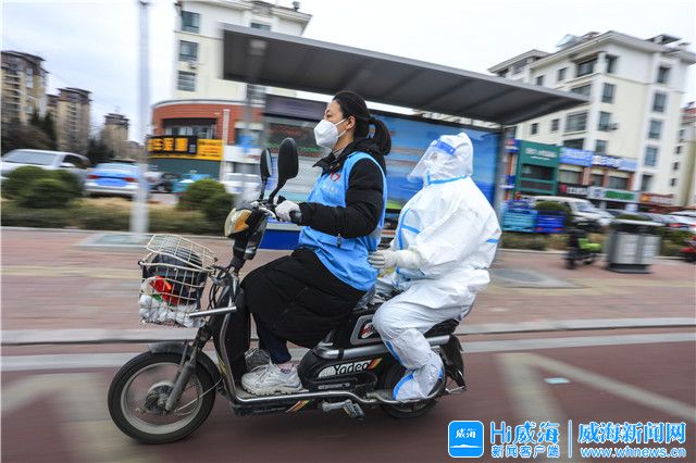 ??????徐璐璐(左)載著醫(yī)護(hù)人員去頤順園小區(qū)入戶進(jìn)行核酸檢測采樣。Hi威海客戶端記者 朱春曉/攝