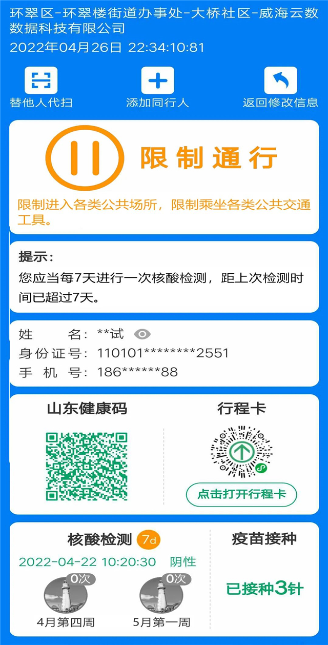 ????提示信息:“您應當每7天進行一次核酸檢測,距上次檢測時間已超過7天”