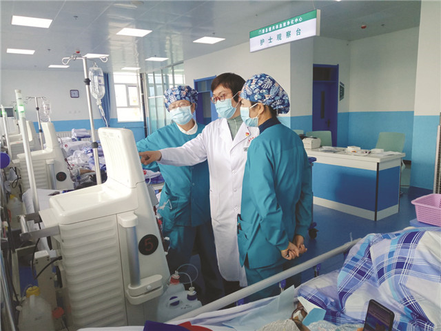 ??????5月13日11時許,在市立醫(yī)院透析室,宋文清穿梭于病床和各透析機之間,觀察患者狀態(tài)和儀器數(shù)據(jù)的變化,同時對患者進行溝通指導(dǎo)。從透前準(zhǔn)備、上機監(jiān)護到完成兩班透析之間的清場,往往需要6個多小時,這是她的工作常態(tài)。
