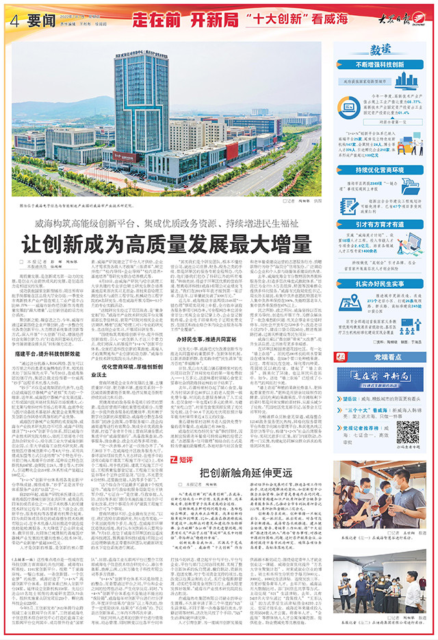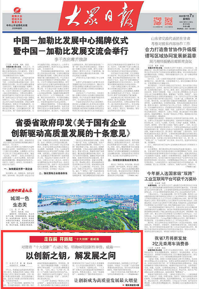 ??????7月7日,《大眾日報》發布一組報道《“十大創新”看威?!?,報道威海多措并舉推動創新發展、增進民生福祉的情況。以下為報道全文: