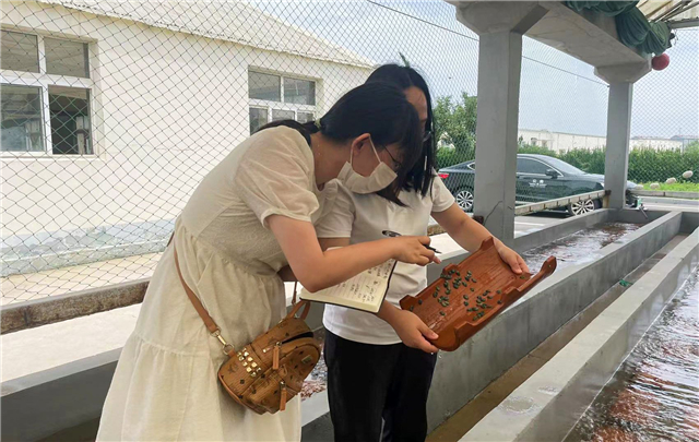 ?記者(左)在尋山集團育苗場了解鮑魚苗育種情況。