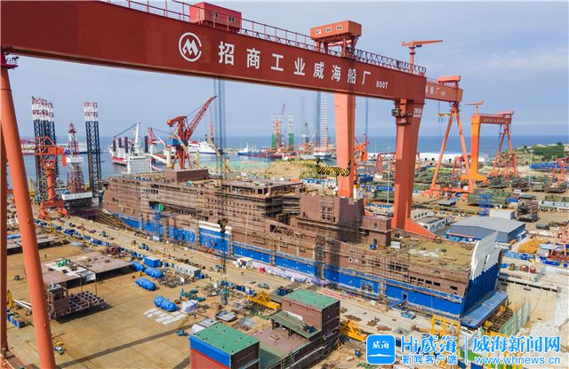 ??招商工業(yè)威海船廠正在建設(shè)的各種類型船舶將船塢和港池?cái)D的滿滿當(dāng)當(dāng)。