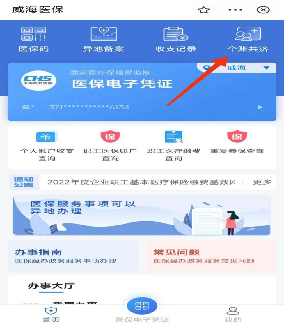 ??????一、在支付寶或者微信首頁輸入“威海醫(yī)?!保c擊進入“威海醫(yī)?!毙〕绦颍醉擖c擊“個賬共濟”。
