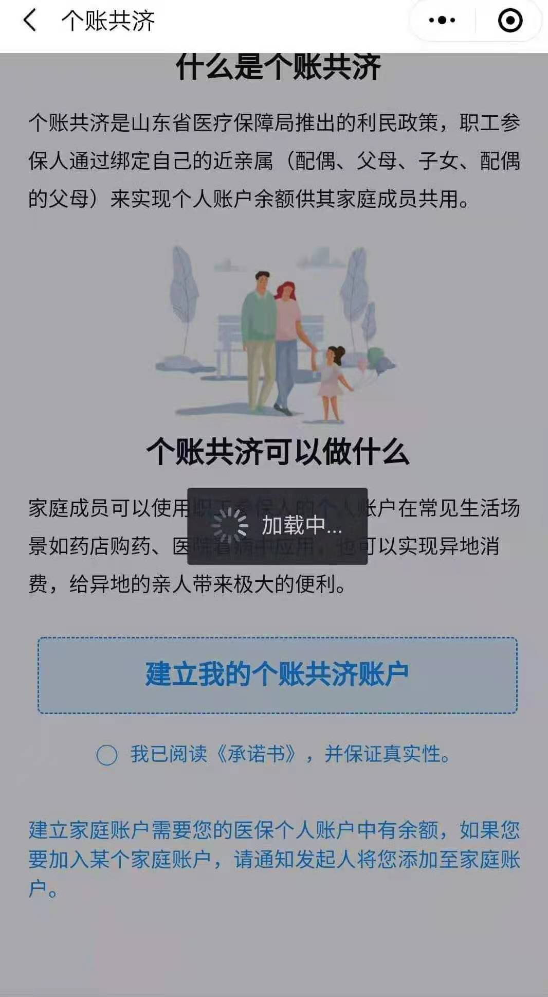 ??????二、進入可以看到“個賬共濟”的介紹,讀完承諾書并保證真實性之后,點擊“建立我的個賬共濟賬戶”。