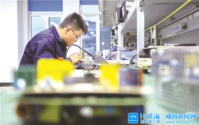 ???威海雙豐物探設備股份有限公司工人正在組裝能源勘探儀器零部件。