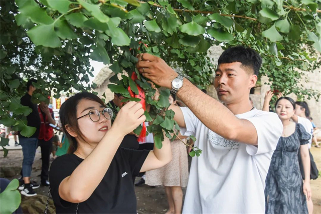 隨后,情侶們各自許下美好心愿,將許愿牌掛在銀杏樹上,寄托美好心愿。同時(shí),情侶們還在現(xiàn)場(chǎng)眾人的祝福下,坐上大花轎,共同掛起“同心鎖”,互送“兩世歡”銀飾手串,象征著兩人永結(jié)同心,愛情長長久久。七夕節(jié)還有烙巧花的習(xí)俗,情侶們與村里的面食制作能手一起動(dòng)手制作巧花,從中體驗(yàn)愛情的甜美滋味。