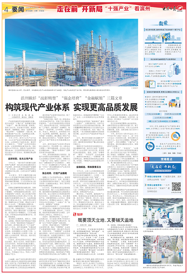 ??????產業是區域經濟發展的根基和支撐。濱州市扭住“十強產業”高質量發展的“牛鼻子”,凝心聚力抓發展、促轉型;堅持工業立市、實業強市不動搖,推進存量變革、增量崛起;做好“戰新轉型”“強企培育”“金融賦能”三篇文章,積極構建戰新產業引領、先進智造業支撐、金融服務業協同的現代產業體系。