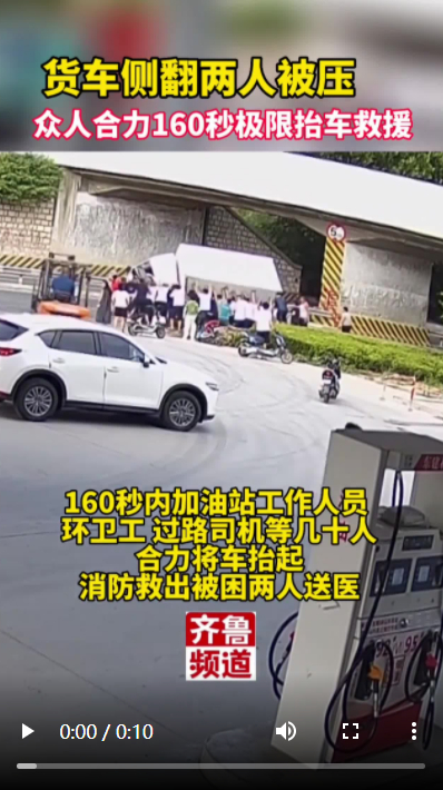 青州貨車側(cè)翻兩人被壓 , 眾人合力160秒極限抬車救援