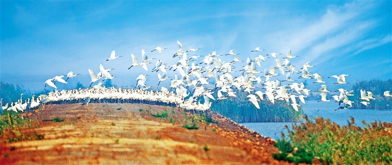▲白琵鷺在東營市黃河三角洲國家級自然保護區(qū)里嬉戲。隨著生態(tài)環(huán)境的日益改善,每年有數百萬只鳥來到保護區(qū)越冬、繁殖。劉月良攝(中經視覺)