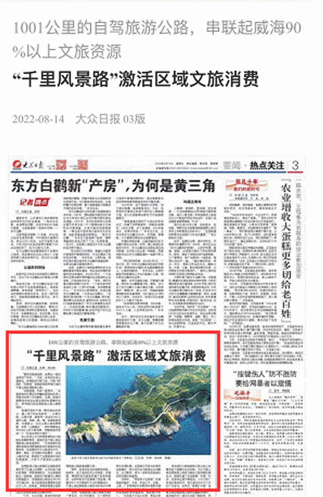 ??????這個夏天,千里山海自駕旅游公路“熱度”持續升級,與各級媒體的廣泛關注密不可分。其中,新華社《山東威海:千里自駕公路拉動暑期旅游》上線僅2個小時,瀏覽量突破百萬;新華網“暑期網紅打卡地”系列直播之《打卡精致威海 奔赴自在山海》全網瀏覽量超過1000萬次;《Highway shows off Shandong charm》一文登上中國日報海外版,讓威海的山海美景走向世界;中國旅游報專版刊登《威海:新業態+新產品 升級濱海休閑度假新體驗》,聚焦我市在文旅品牌建設、消費提振等方面結出的碩果;大眾日報圖文報道《“千里風景路”激活區域文旅消費》中提到,自駕公路讓威海的全域旅游資源實現交通上的串聯;山東新聞聯播播出《千里山海自駕旅游公路讓威海精致“出圈”》,引發熱烈反響。