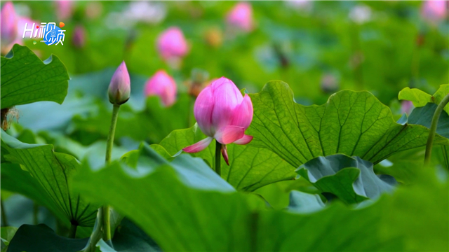 ??????夏末初秋,威海榮成市隆霞湖的荷花正隨著微風(fēng)蕩漾,湖內(nèi)生機(jī)勃勃的景象猶如一副秀美的畫卷。