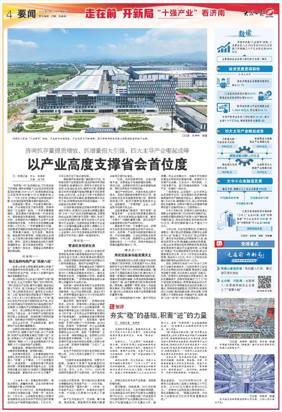 發展是第一要務,產業是發展的第一支撐,產業高度決定了城市高度。濟南市錨定“工業強市”航向,一手抓存量提質增效,緊緊圍繞大數據與新一代信息技術、智能制造與高端裝備、精品鋼與先進材料、生物醫藥與大健康四大主導產業謀劃推進鏈式發展,力爭年內實現規模總量突破1.4萬億元。一手抓增量招大引強,加快推進濟南新舊動能轉換起步區產業導入,聚焦量子通信、空天信息、集成電路、新能源汽車等領域,加強頭部企業招引,全力培育以新動能為硬核支撐的新增長極。同時,堅持以高端制造業吸引集聚高端服務業,著力構建有效服務“十強產業”發展的一流生態,厚植省會高質量發展的新動能。