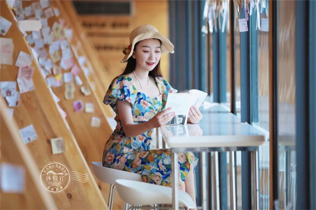 ??????踩著木樓梯拾級而上,每一個座位都可以看海,聽著館內緩緩流淌的音樂,坐在全景落地窗前,或倚在欄桿上。