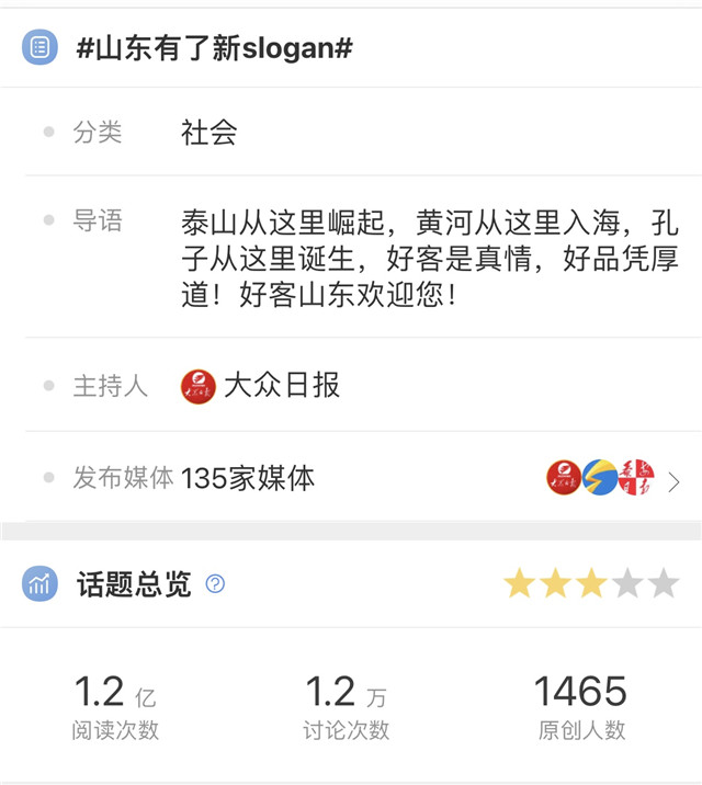 講好故事,要創新驅動。連日來,全省各級各類媒體創新生產、全媒傳播,形成主流輿論強勢。宣傳推介活動在北京舉行當日,大眾日報即在全網發起海報接力宣傳活動,#好客山東 好品山東甩海報#在山東16市均登上同城熱搜榜,其中12市位居熱搜榜首位,超高人氣的話題持續擴大宣傳聲量。中秋假期,由大眾日報主持的微博話題#山東有了新slogan#登上全國熱搜榜,2天時間總閱讀量就達到1.2億次,引發刷屏式傳播。