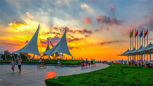 夕陽西下,夜幕臨近之時,夕陽映照下余霞成綺的天空籠罩著人群,面前是瑰麗爛漫的余暉和波光粼粼的大海,一切都那么的如夢如幻、安靜美好。