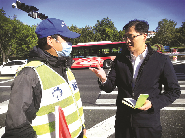 ??劉衍(右)與文明志愿者交談工作經驗
