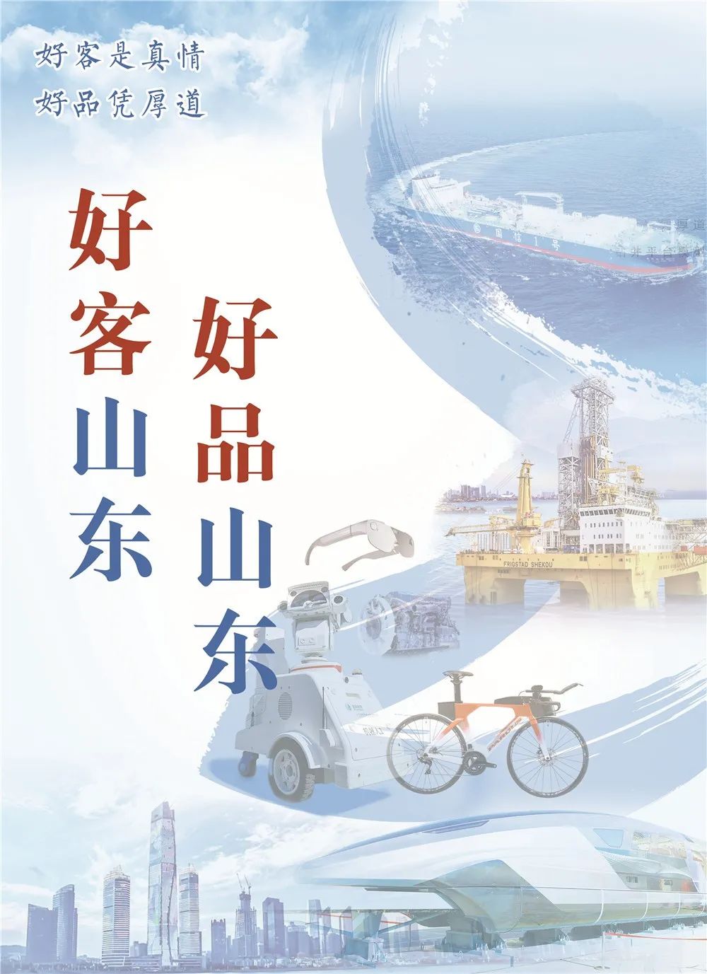 ??????就在幾天前的10月18日,人民日報同樣整版聚焦“好客山東 好品山東”。當日刊登的海報中,國信1號、藍鯨1號、時速600公里的高速磁懸浮列車等大國重器悉數“出鏡”,5G智能電力巡檢機器人、歌爾AR智能眼鏡、濰柴本體熱效率51.09%柴油發動機、瑞豹自行車等科創新品一一登場。