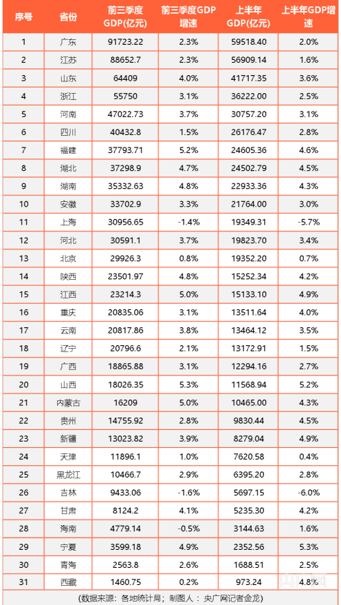 ??????11月2日,陜西統計局發布數據顯示,前三季度全省實現地區生產總值23501.97億元,按可比價格計算,同比增長4.8%。至此,全國已經有31個省市發布了前三季度地區生產總值(GDP)增長情況,其中廣東經濟總量達91723.22億元,繼續穩居全國第一,江蘇、山東分別位列第二名和第三名。