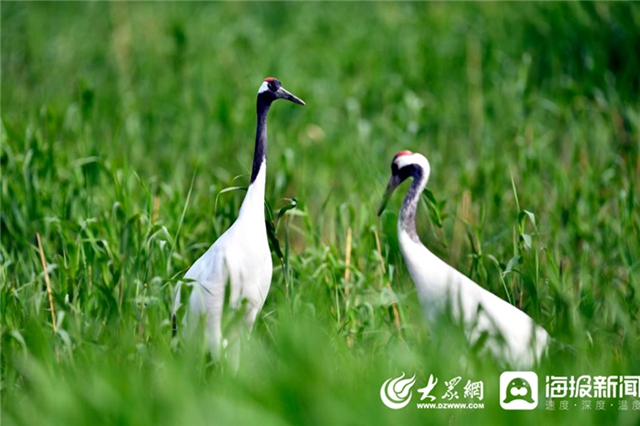 黃河三角洲自然保護區(qū)的兩只丹頂鶴在水草間棲息。新華社記者郭緒雷 攝