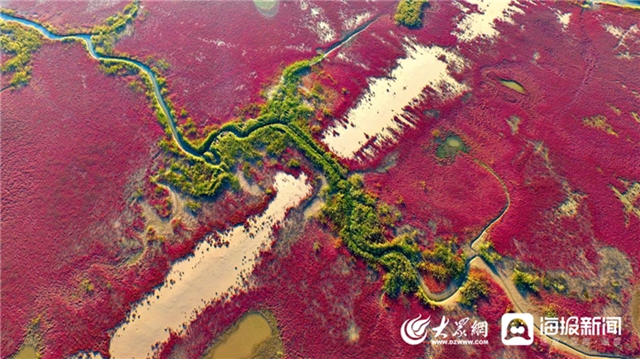 山東黃河三角洲國家級自然保護區(qū)內(nèi),翅堿蓬給濱海灘涂濕地鋪上“紅地毯”。楊斌 攝