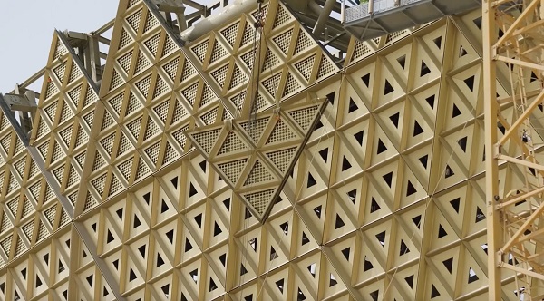 盧塞爾體育場的設計靈感源于阿拉伯傳統琺瑯燈格紋飾,整體造型如同盛滿椰棗的金碗,幕墻的外立面自上而下呈弧形變化。外幕墻總面積約6萬平方米,由近4萬個小三角單元組成4200多個吊裝單元,且每個小三角單元的尺寸都有所差異,將這樣的藝術設計變成宏偉建筑,對建造技術是極高的考驗。