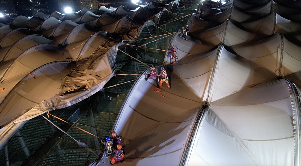施工中的索膜結構聲學屋面,這種結構在保證體育場外形美觀的基礎上,還具備一定的溫度控制效果