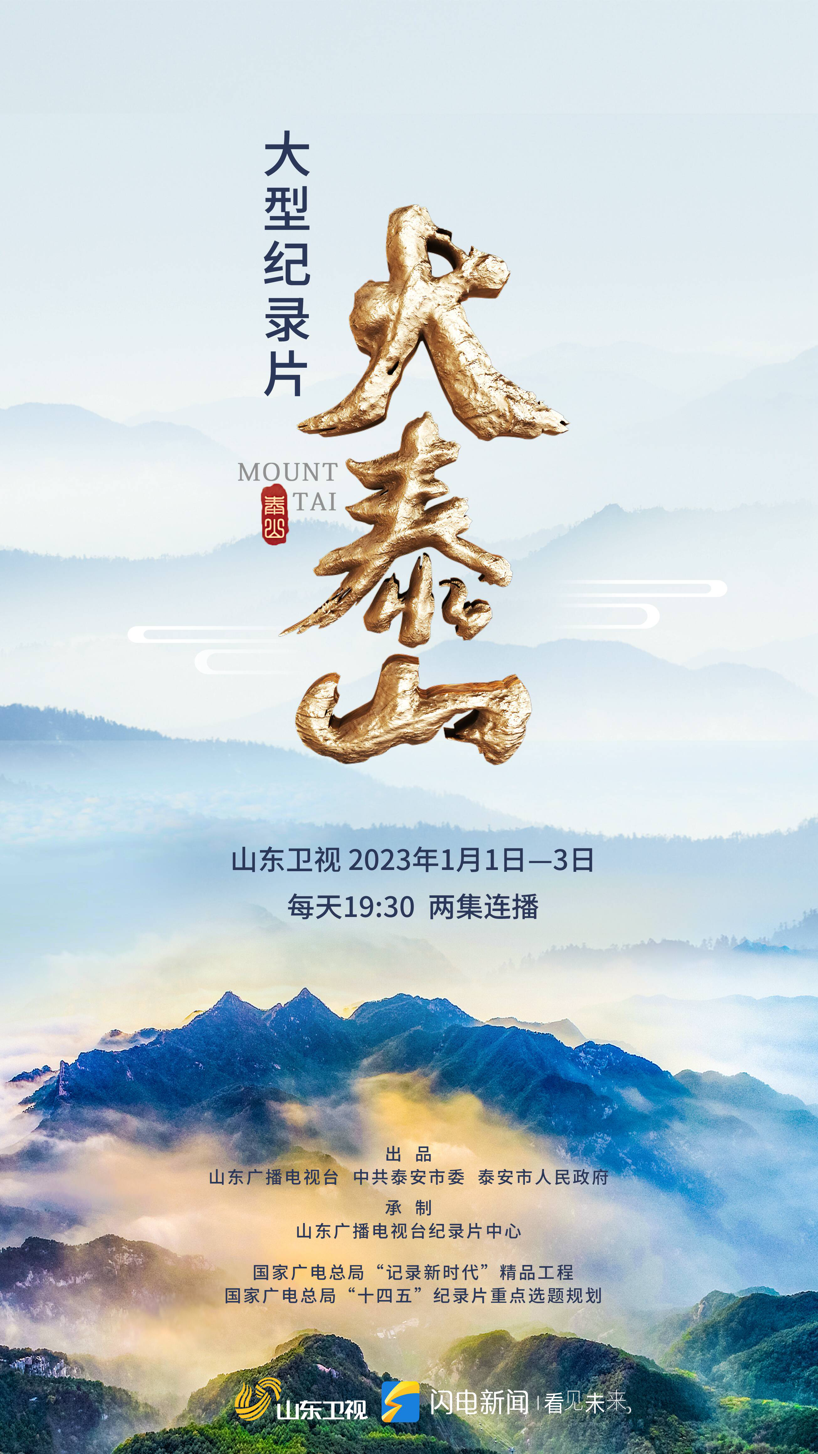??????由山東廣播電視臺聯合泰安市委市政府策劃出品的六集大型紀錄片《大泰山》將于2023年1月1日至3日在山東衛視晚間黃金時段播出。閃電新聞客戶端屆時同步播出。