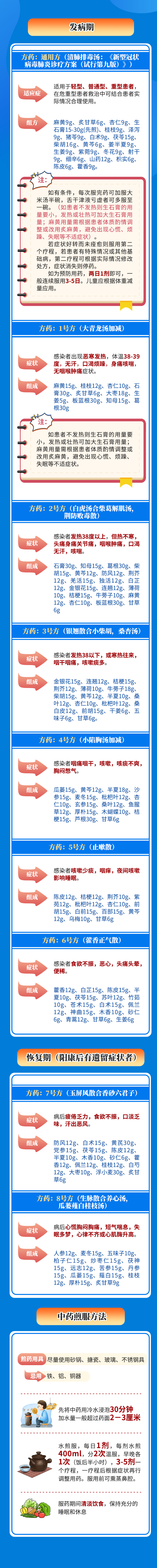 ??????為全面貫徹落實新冠病毒感染“乙類乙管”的防控策略、山東省衛生健康委《關于公布<山東省治療新冠病毒感染中藥協定處方>的通知》、威海市疫情處置工作指揮部醫療救治組《關于做好在城鄉基層充分應用中醫藥方法開展新冠病毒感染防治工作的通知》要求,充分發揮中醫藥在疫情防控中“保健康、防重癥”方面的特色優勢,推動新冠病毒感染中醫藥治療工作科學有序開展,威海市衛生健康委、中醫藥管理局在前期印發的《威海市新冠病毒感染中醫藥宣教及居家防治指導方案》的基礎上,結合《山東省治療新冠病毒感染中藥協定處方》,再次組織專家根據威海市地域及環境特點,對相關的癥狀進一步細化,制定了威海市“乙類乙管”階段治療新冠病毒感染中藥協定處方1-8號方。
