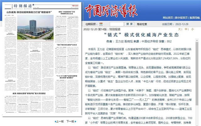 ??????近日,《中國經濟導報》以《“鏈式”模式優化威海產業生態》為題,聚焦威海積極踐行“鏈式”思維模式,深入推進產業鏈供應鏈創新鏈協同發展,以下為報道全文: