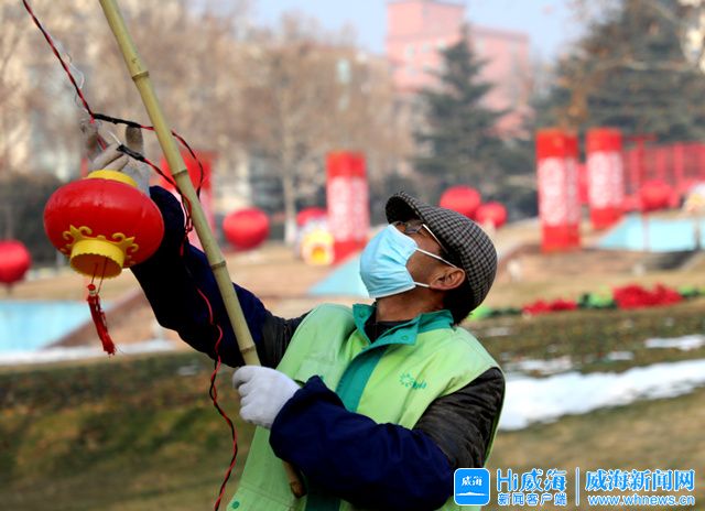 ??????春節臨近,威海市園林部門工作人員開始布置市人民廣場立體景觀,營造喜慶的節日氛圍。
