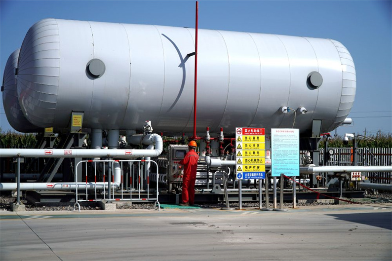 ??????2022年9月18日,在位于山東省淄博市高青縣的齊魯石化—?jiǎng)倮吞锇偃f(wàn)噸級(jí)碳捕集、利用與封存項(xiàng)目10號(hào)注氣站,一名工作人員在檢查設(shè)備。新華社記者徐速繪 攝