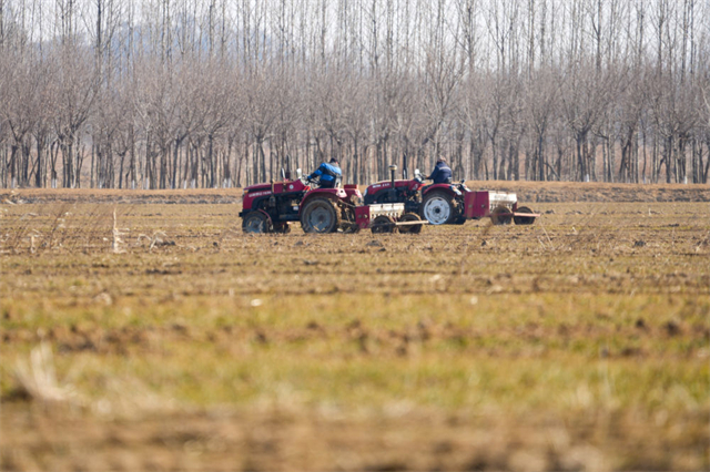 ??????↑ 2月15日,山東省威海市文登區金農會農業專業合作社農機手在為麥地追肥。